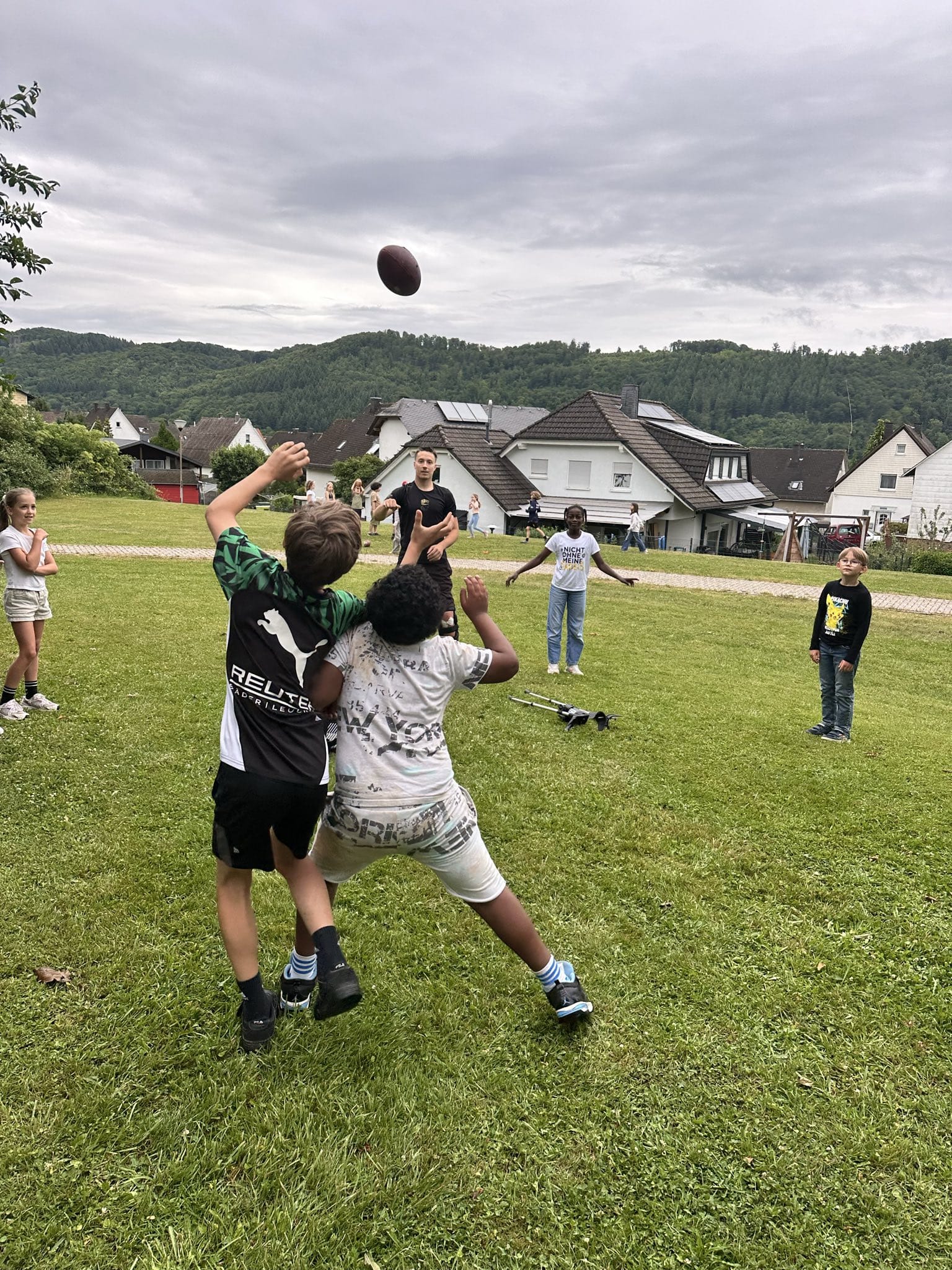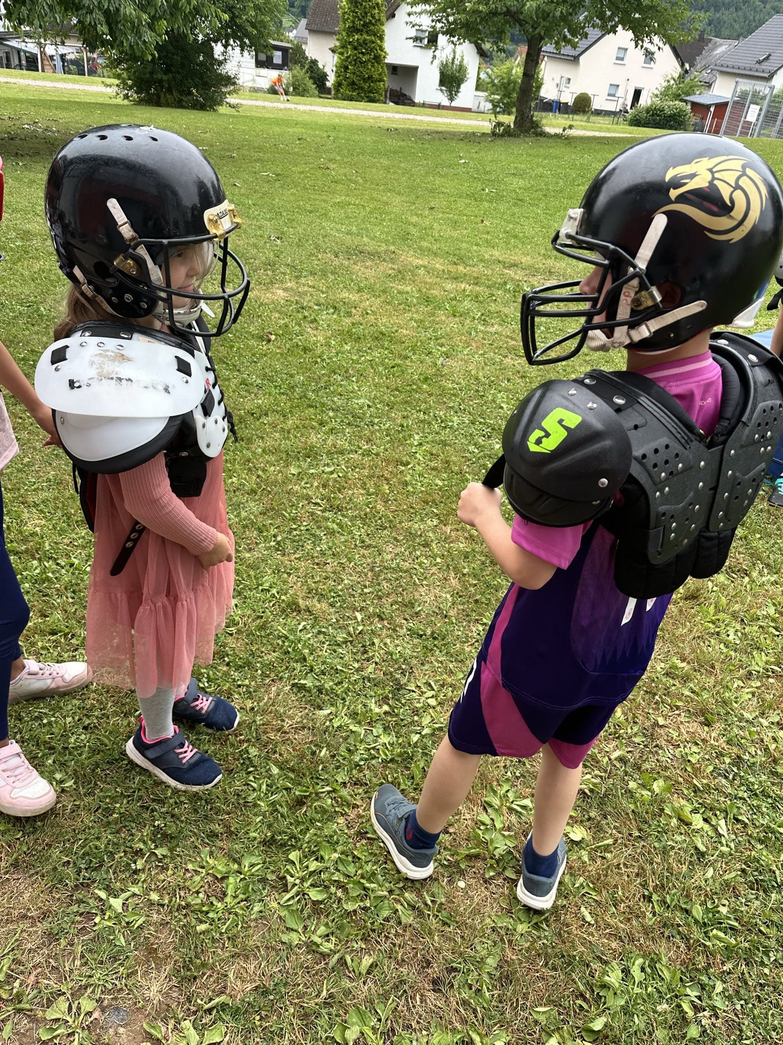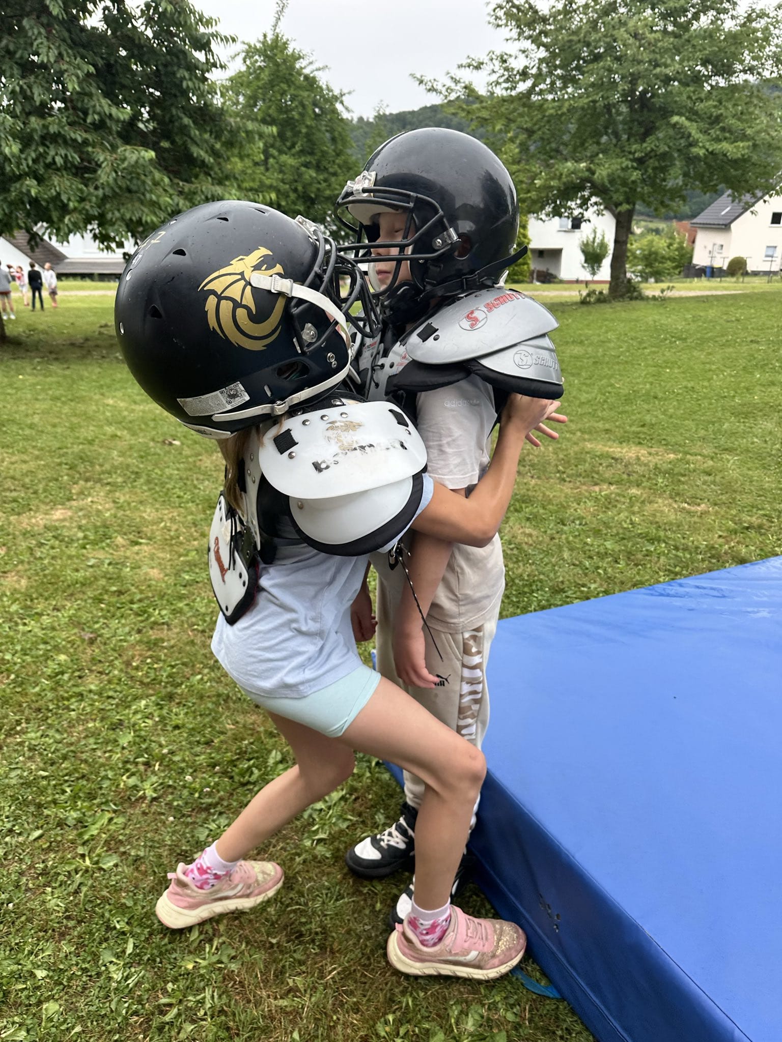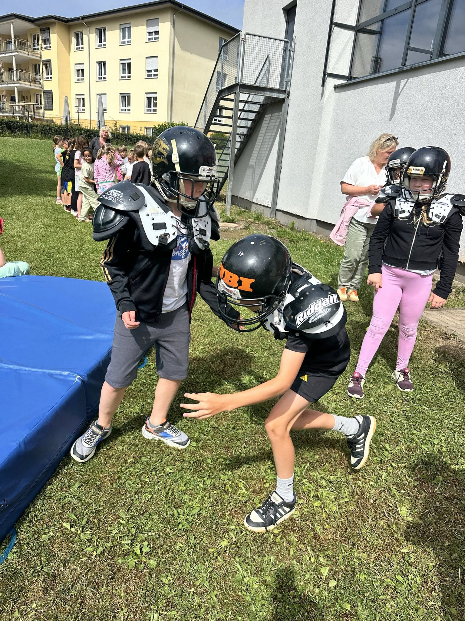 Am 27.06.25 stand für viele Klassen American Football auf dem Programm. Frau Stolz brachte aus ihrem Gießener Football Verein, den Gießener Golden Dragons, nicht nur Helme und Schulterpads mit, sondern auch einen Footballspieler aus der 2. Bundesliga. Die Kinder konnten mehrere Stationen ausprobieren und spielerisch in die Welt des Tacklens (freiwillig) und des Ball Fangens reinschnuppern. Besonders interessant war es herauszufinden, wie es sich anfühlt einen Ball zu schießen, der nicht rund ist.