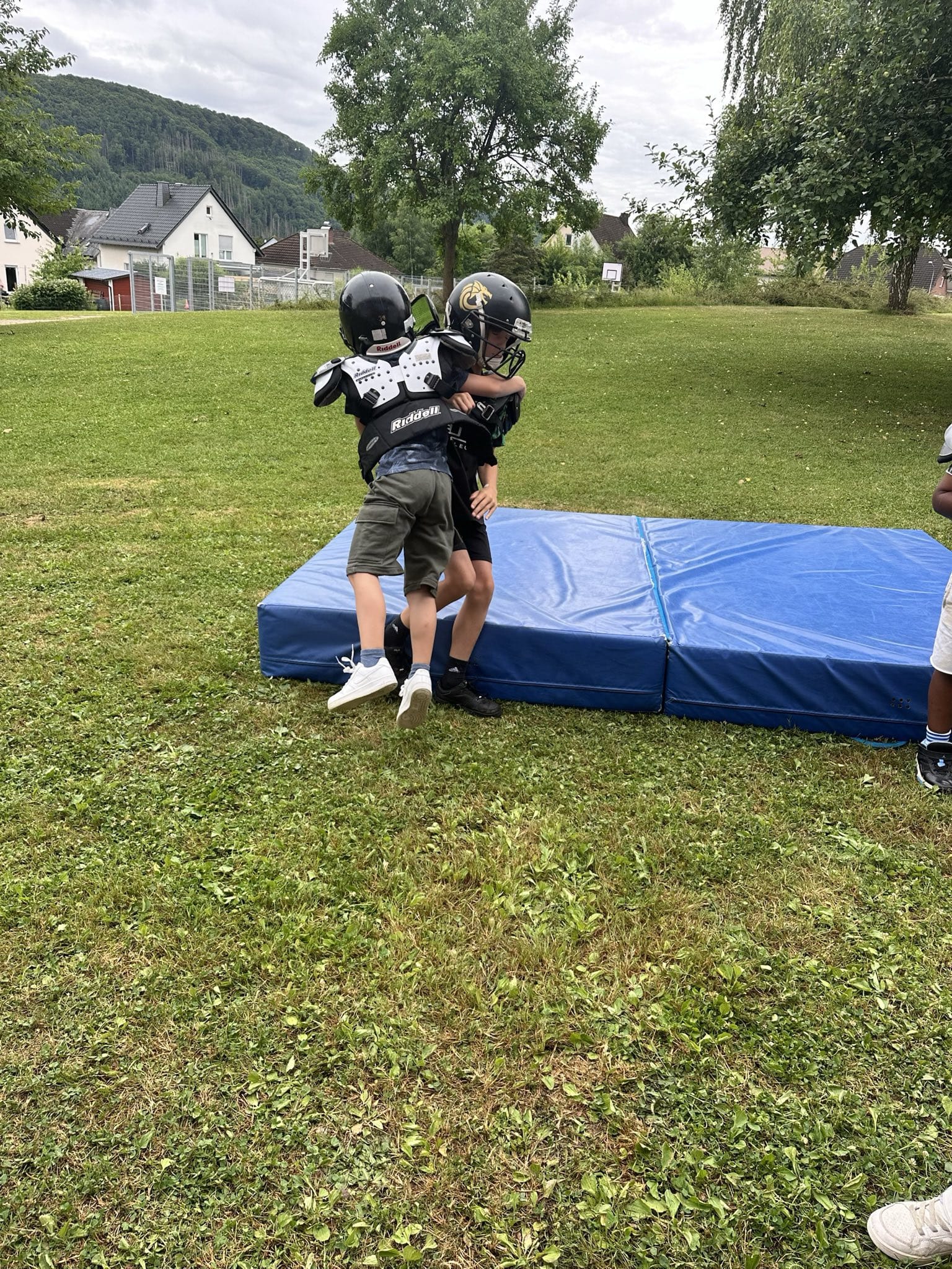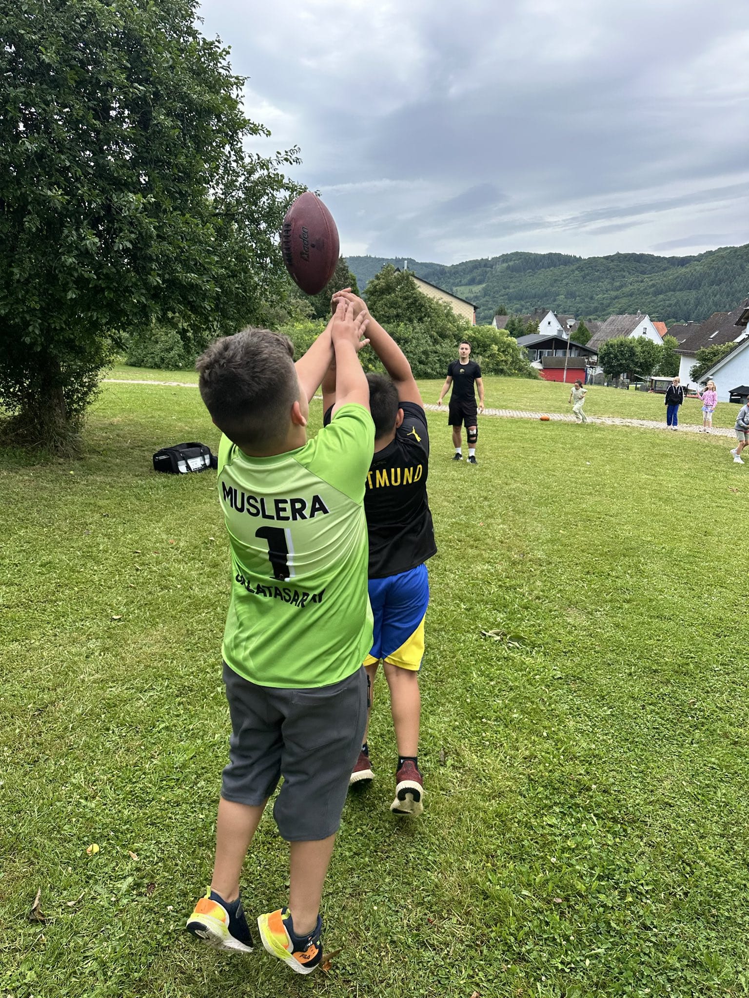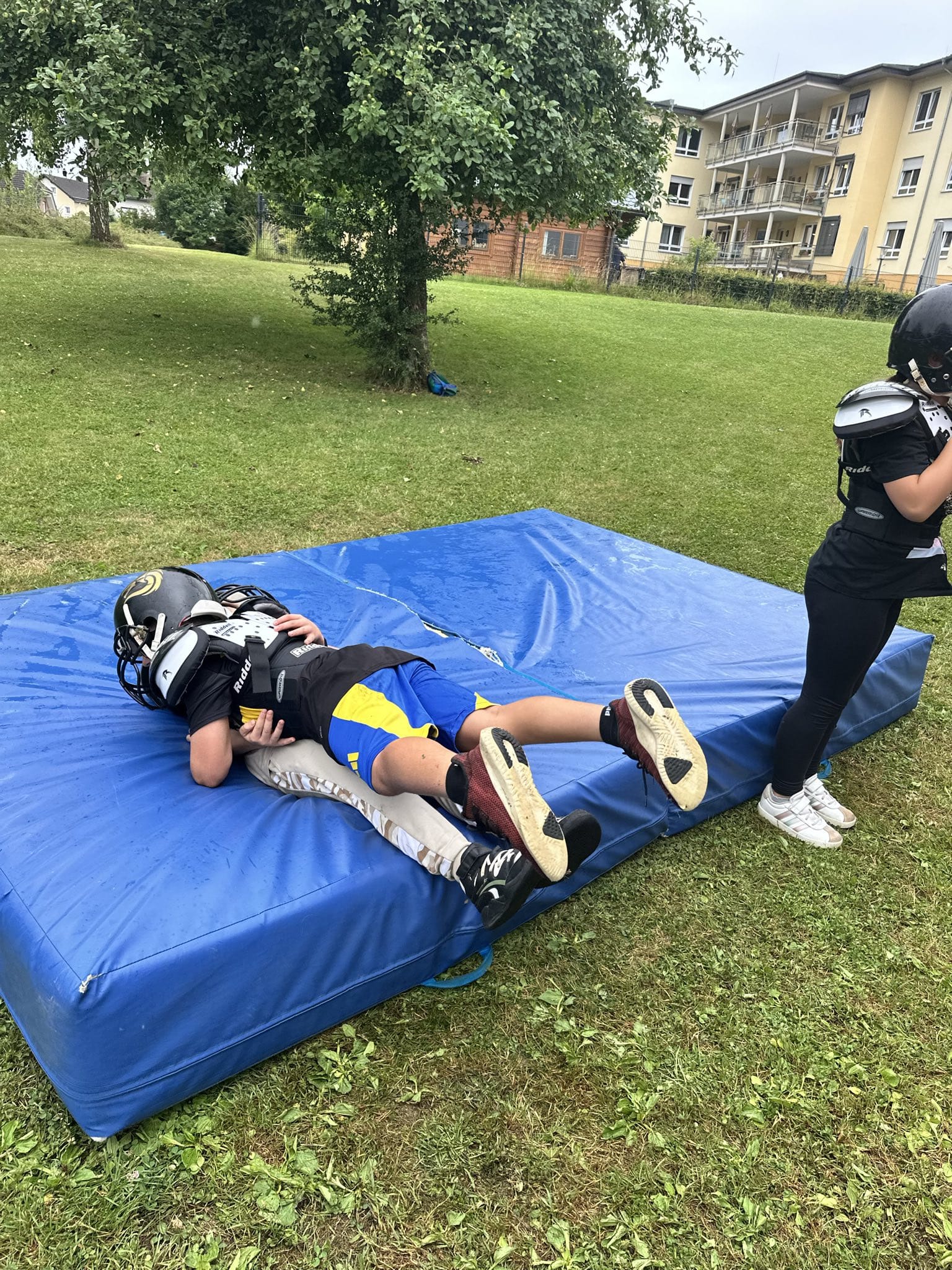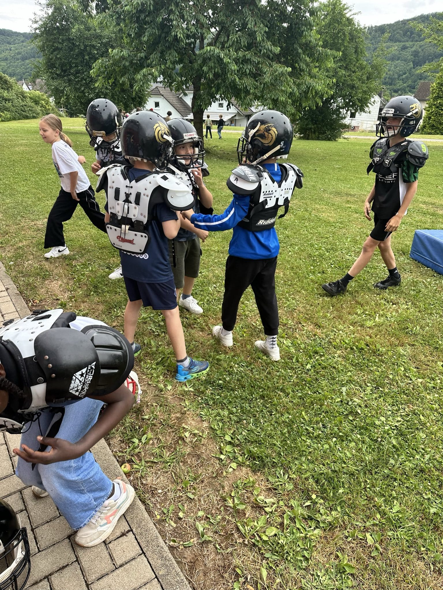 Am 27.06.25 stand für viele Klassen American Football auf dem Programm. Frau Stolz brachte aus ihrem Gießener Football Verein, den Gießener Golden Dragons, nicht nur Helme und Schulterpads mit, sondern auch einen Footballspieler aus der 2. Bundesliga. Die Kinder konnten mehrere Stationen ausprobieren und spielerisch in die Welt des Tacklens (freiwillig) und des Ball Fangens reinschnuppern. Besonders interessant war es herauszufinden, wie es sich anfühlt einen Ball zu schießen, der nicht rund ist.